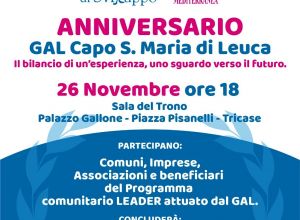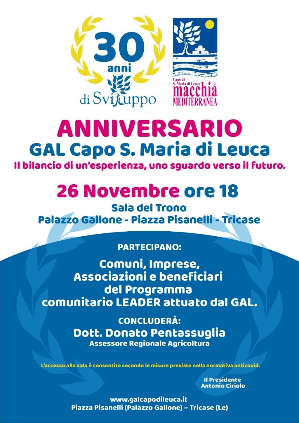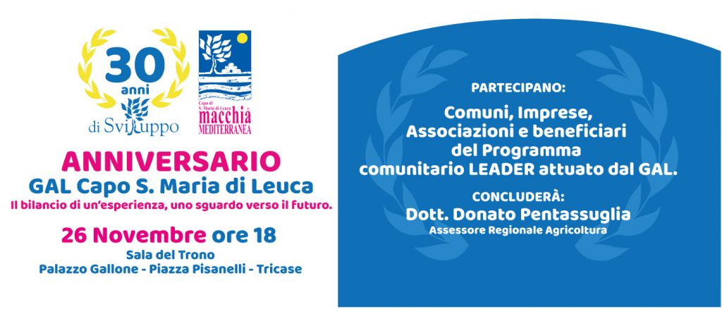 Venerdì 26 novembre alle ore 18.00 presso la Sala del Trono, Palazzo Gallone in Piazza Pisanelli a Tricase, si terrà un incontro in occasione dei 30 anni del GAL Capo S. Maria di Leuca.