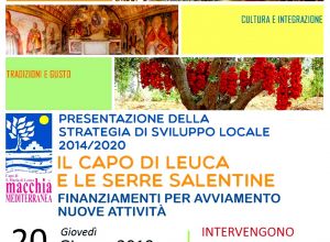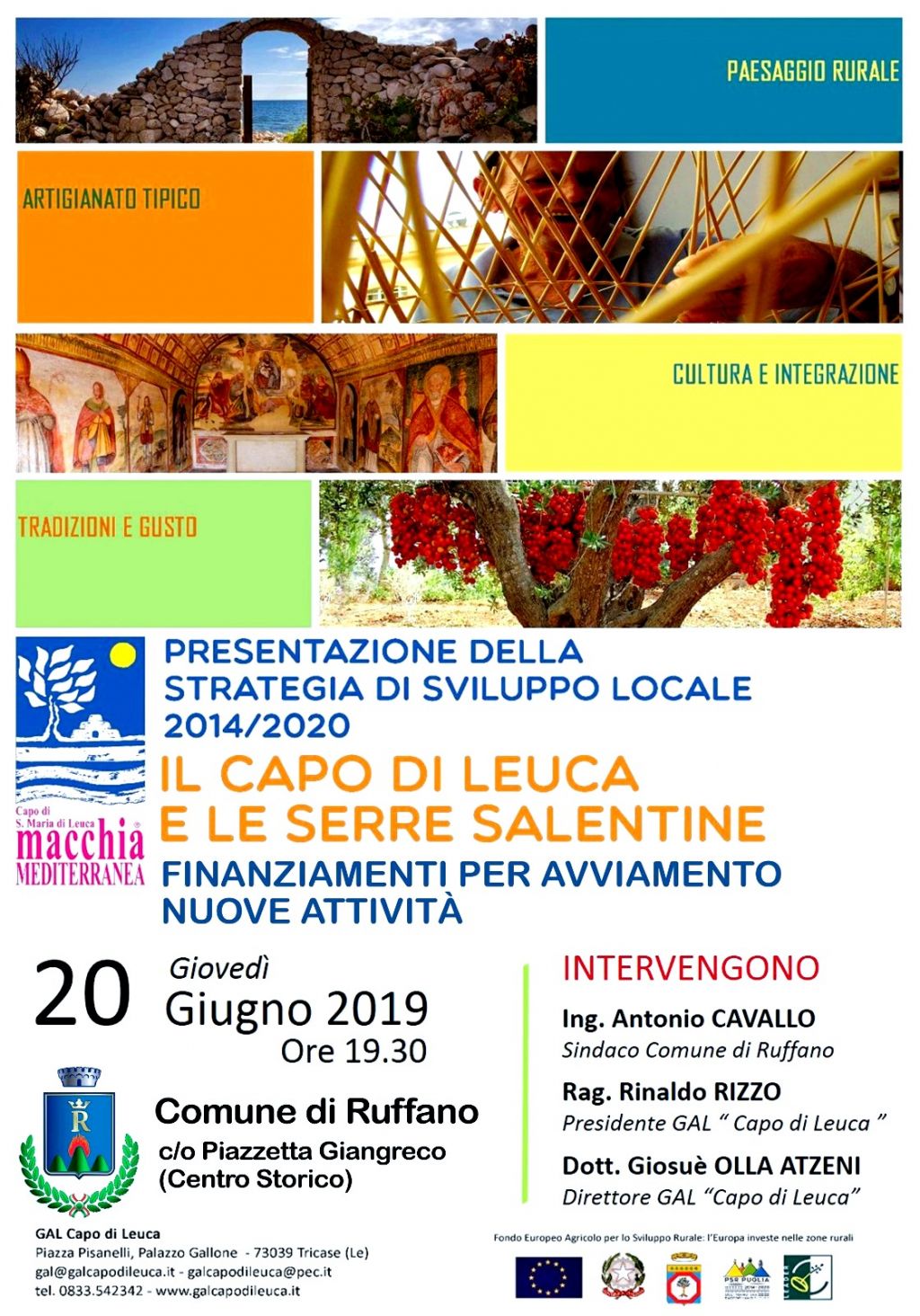 Giovedì 20 Giugno prossimo alle 19.30, a Ruffano presso Piazzetta Giangreco (Centro Storico),si svolgerà un incontro pubblico per la Presentazione della Strategia di Sviluppo Locale “il Capo di Leuca e le Serre Salentine”, la cui dotazione finanziaria ammonta a circa 7,5 milioni di euro di quota pubblica, approvata nell’ambito della Misura 19 del PSR Puglia 2014 – 2020 e presentare i bandi per la concessione di contributi a fondo perduto nell’ambito degli interventi: 4.1 “Valorizzazioni delle produzioni tipiche locali” e 4.2 “Servizi al turismo rurale” L’iniziativa è rivolta a giovani e donne, che intendono avviare un’attività imprenditoriale, a operatori dei settori: turismo rurale e artigianato locale. Interverranno: l'Ing. Antonio CAVALLO, Sindaco di Ruffano, il Rag. Rinaldo RIZZO, Presidente GAL Capo di Leuca e il Dott. Giosuè OLLA ATZENI, Direttore GAL Capo di Leuca. L’incontro pubblico è rivolto anche alle aggregazioni di soggetti pubblici/privati in ambito sociale, ai gruppi di acquisto solidale e alle associazioni che si occupano di servizi di manutenzione ambientale che nell’ambito del PAL, saranno destinatarie di agevolazioni finanziarie.