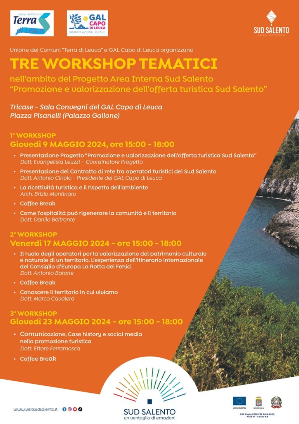 Al primo workshop interverranno il Coordinatore del progetto, Dott. Evangelista Leuzzi e il Dott. Antonio Ciriolo, Presidente del GAL Capo di Leuca; si proseguirà poi con gli interventi dell’Arch. Brizio Montinaro, esperto di ecocompatibilità edilizia e con il Dott. Danilo Beltrante, Formatore e Direttore della Vivere di Turismo Business School.