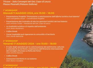 Agli operatori che, nelle scorse settimane, hanno manifestato l’interesse a far parte della rete, saranno indirizzati i tre workshop organizzati dal GAL Capo di Leuca con l’ausilio di qualificati professionisti del settore. I tre incontri si svolgeranno a Tricase nella Sala Convegni del GAL Capo di Leuca in Piazza Pisanelli (Palazzo Gallone) dalle ore 15.00 alle 18.00, a partire da giovedì 9 maggio 2024.